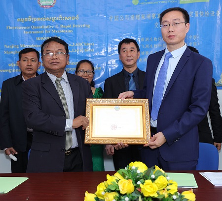 2019年12月5日,在中國(guó)農(nóng)業(yè)農(nóng)村部專家、中國(guó)駐柬埔寨使領(lǐng)館參贊、柬埔寨農(nóng)林漁業(yè)部官員及專家的見(jiàn)證下,在柬埔寨農(nóng)林漁業(yè)局檢測(cè)中心舉行了上海飛測(cè)生物科技有限公司(南京微測(cè)全資子公司)真菌毒素快速檢測(cè)箱的捐贈(zèng)儀式,并進(jìn)行了相關(guān)的技術(shù)交流和培訓(xùn),簽訂了相關(guān)合作協(xié)議,為雙方以后的深入合作奠定了良好的基礎(chǔ)。